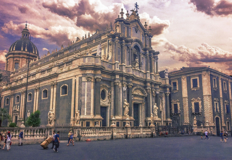 Na opačnej strane ostrova, teda na východnom pobreží, leží mesto Catania. Mesto v roku 1693 zničilo zemetrasenie a dnes je lokalitou najnápadnejších barokových pamiatok z lávového kameňa na Sicílii. Leží učupené pod Etnou a je aj dobrým východiskovým bodom na spoznávanie ďalších zaujímavých lokalít.
